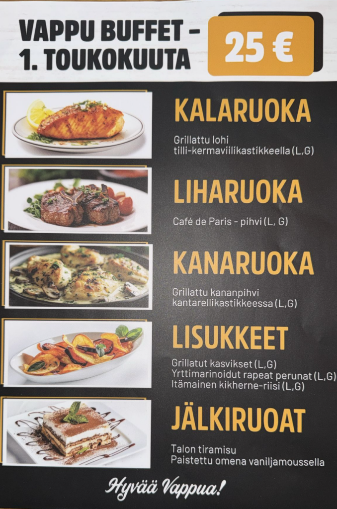 • HERNEKEİTTO (L, G)• RUOTSALAİSET LİHAPULLAT JA RUSKEAJUUSTOKASTİKE (L, G)• ITALİALAİNEN UUNİLOHİ PESTOLLA JA PARMESAANİLLA GRATİNOİTUNA (G)• PORTUGALİLAİNEN BROİLERİ PERİ-PERİKASTİKKEELLA (L, G)• KANA-CAESARSALAATTİ (L, G)• LETUT, KERMAVAAHTO JA HİLLO